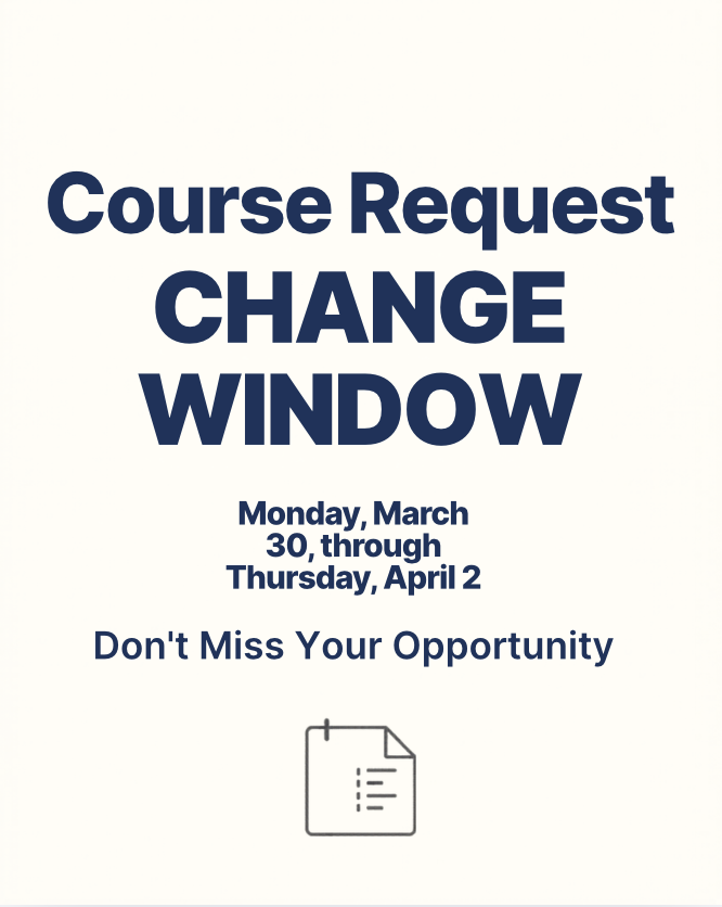Course Request Change Window for 2026-2027 Schedules: Current 10th and 11th Graders Only Students will have one opportunity to change course REQUESTS for their 2026-2027 schedules. This schedule re...